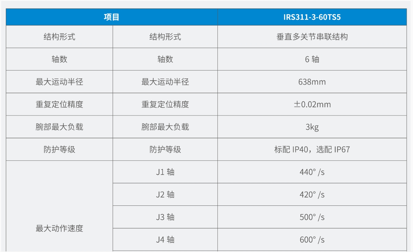 IRS311-3 系列6 關(guān)節(jié)機器人最大臂長可達638mm,最大負載可達3kg,具有結(jié)構(gòu)緊湊、輕巧、柔性化高、重復定位精度高、運動速度快等特點。配備IRCB500系列控制系統(tǒng),具有很強的易用性和可靠性。廣泛應用于3C、汽車等行業(yè)的搬運、分揀、點膠、裝配等領域,助力于高精高速的柔性生產(chǎn)。