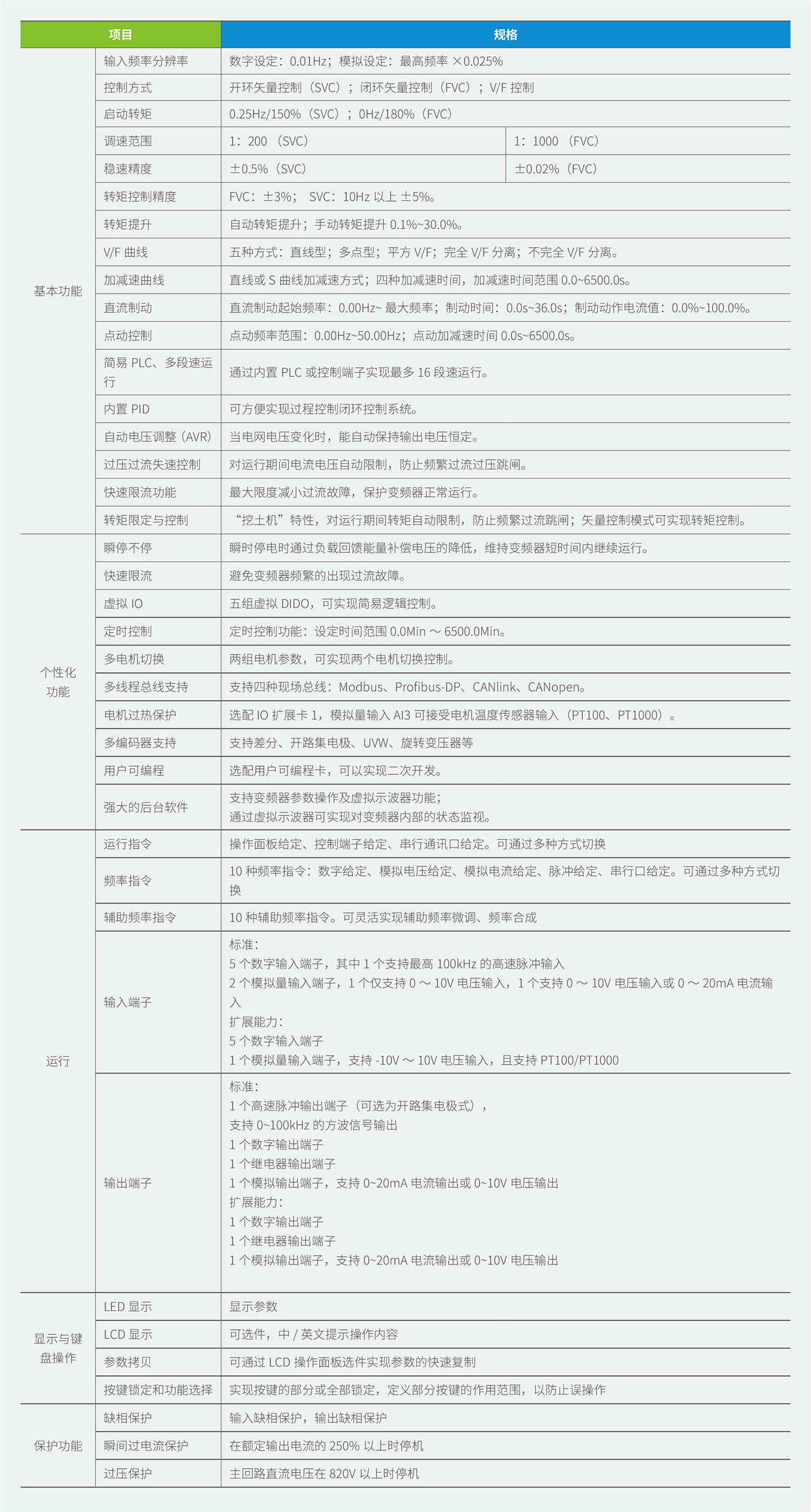 高性能電流矢量控制算法,提升設(shè)備進(jìn)度;低速大轉(zhuǎn)矩,提高設(shè)備低速控制性能;支持多種編碼器,高精度閉環(huán)控制;完善的直流制動(dòng)回路方案,0.4~75KW內(nèi)置制動(dòng)單元