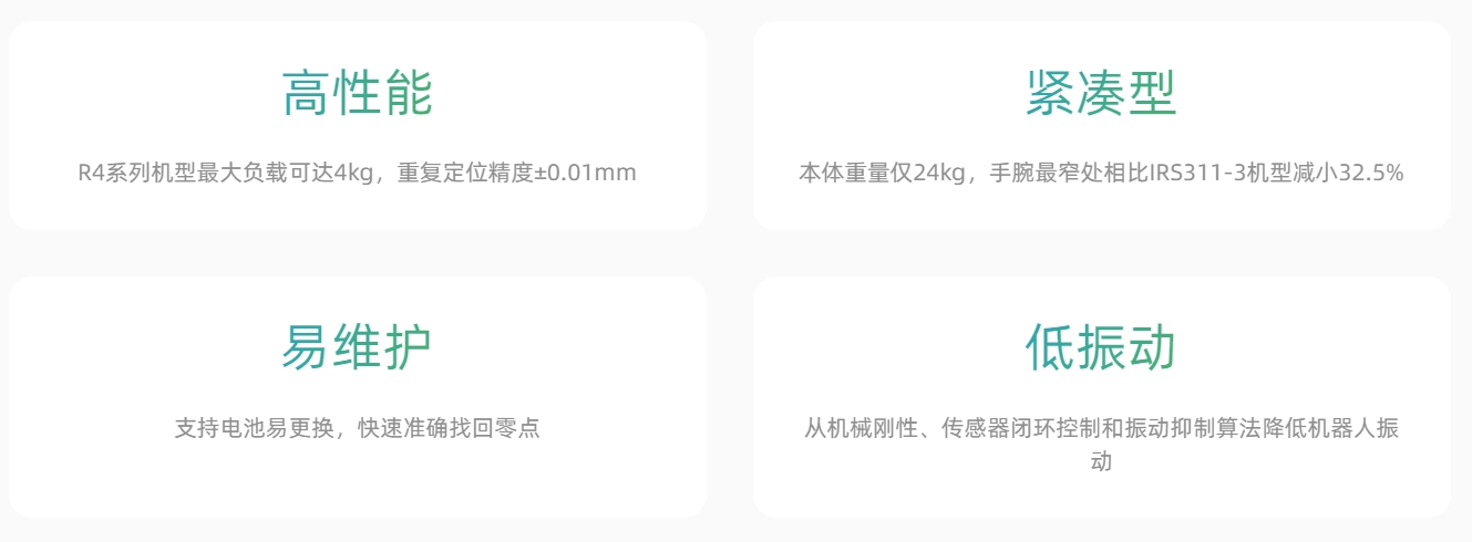 IR-R4系列六關(guān)節(jié)機(jī)器人結(jié)構(gòu)緊湊,結(jié)構(gòu)緊湊,整機(jī)高度、結(jié)構(gòu)高度達(dá)到行業(yè)新水平。應(yīng)用行業(yè)主要分布在3C、鋰電、光伏、顯示行業(yè),同時(shí)滿足產(chǎn)品在裝配、涂膠的場(chǎng)景應(yīng)用需求。